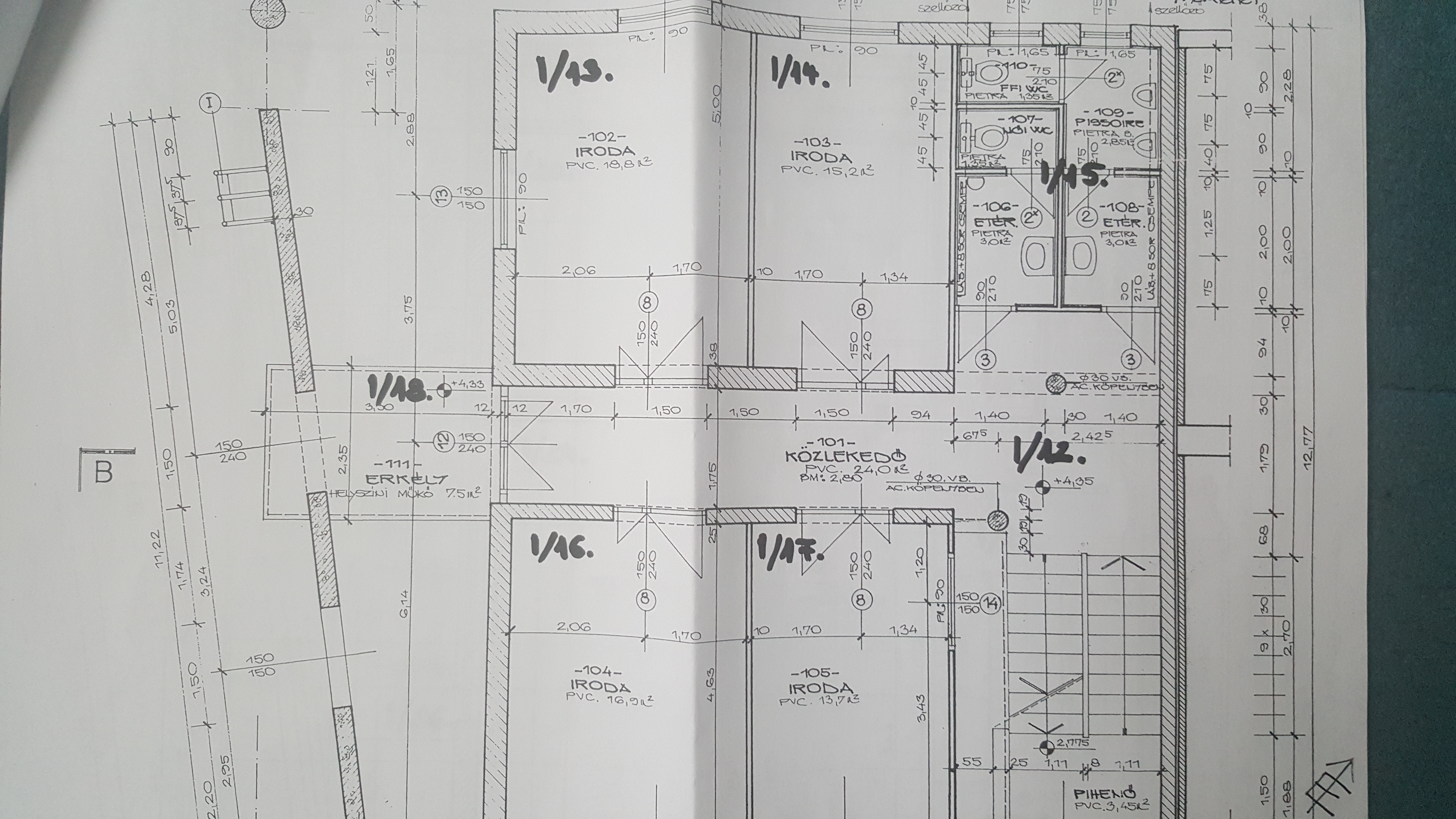 I. emelet: Az első szint négy különálló irodaterületből áll. A közlekedőfolyosó bal valamint a jobb oldalán is két-két iroda helyezkedik el. A folyosón külön női és férfi toalett található.